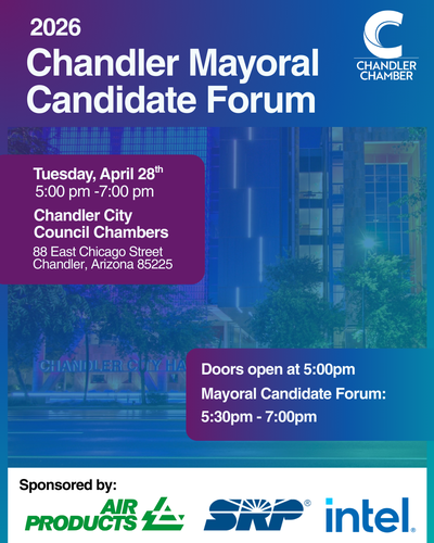 The 2026 Chandler Mayoral Candidate Forum, presented by the Chandler Chamber Good Government Committee, provides a respectful and informative setting for mayoral candidates to discuss their platforms, leadership philosophies, and strategies for addressing key issues facing Chandler’s future. With questions developed in a neutral, business-oriented manner, this forum will help voters learn how each candidate plans to guide the city and strengthen its business community.